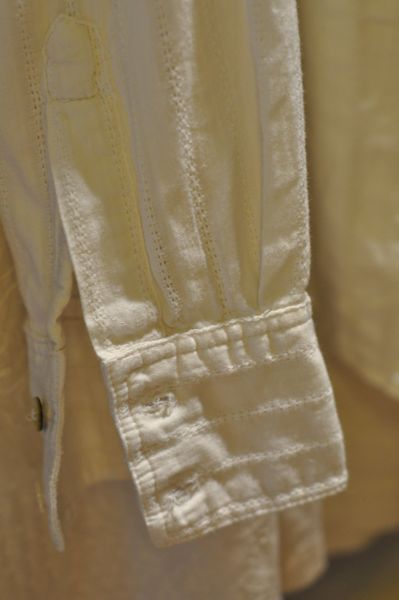 This shirt is an over achiever. Basically Mod-oDoc, the company who made it, wanted this shirt to have all the bells and whistles it possibly could. So it has cargo like pockets, side pockets at the waist, extra wide cuffs, a collar and collar stand, a double button placket, tabs with buttons so you can roll up the sleeves and button them in place. That is a lot of stuff to be going on in one shirt. I think this is their version of cruise-wear and I am making changes on it left and right.