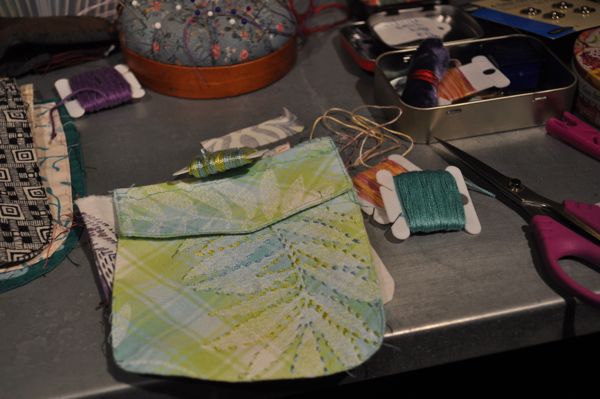 This is a pocket taken from Mija’s Largess. I am using hand dyed pearl cotton to highlight the printed leaves. This pocket is not yet complete, but it is calling my name as I type.