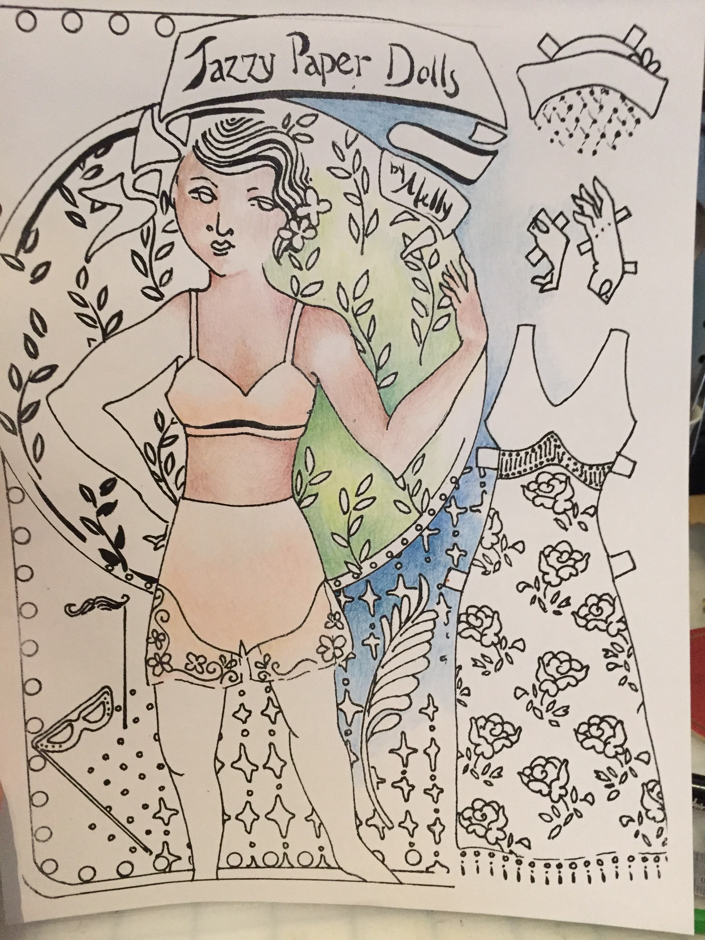 This month, we were asked to draw faces with 1920’s hairstyles, which then turned into designing a coloring book cover using these drawings. The above is my contribution. You may not know that we moved one floor up this month. I signed up for this class and then quickly got busy moving. I was fearful that I would not be able to complete the assignment in time, but yesterday, I did it!