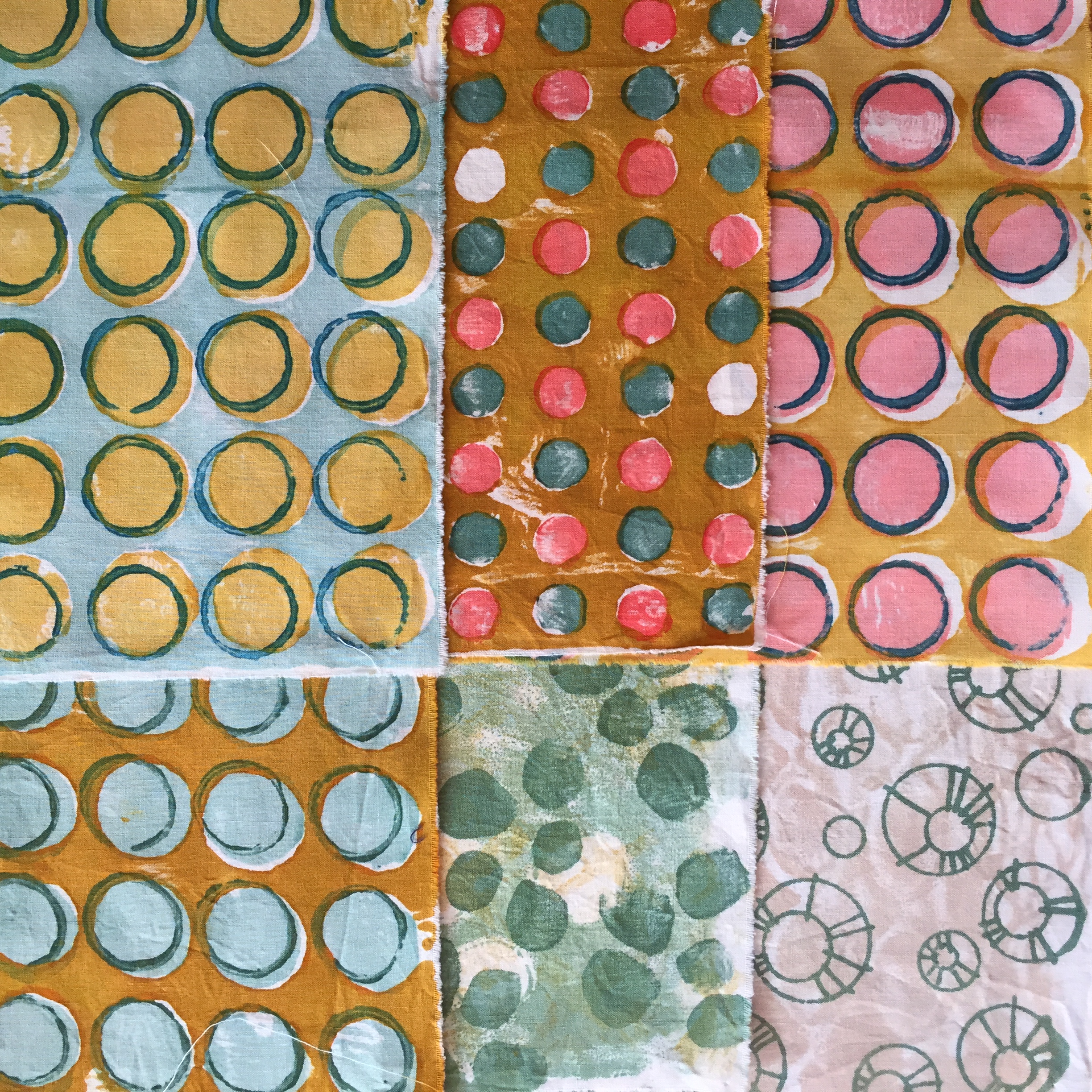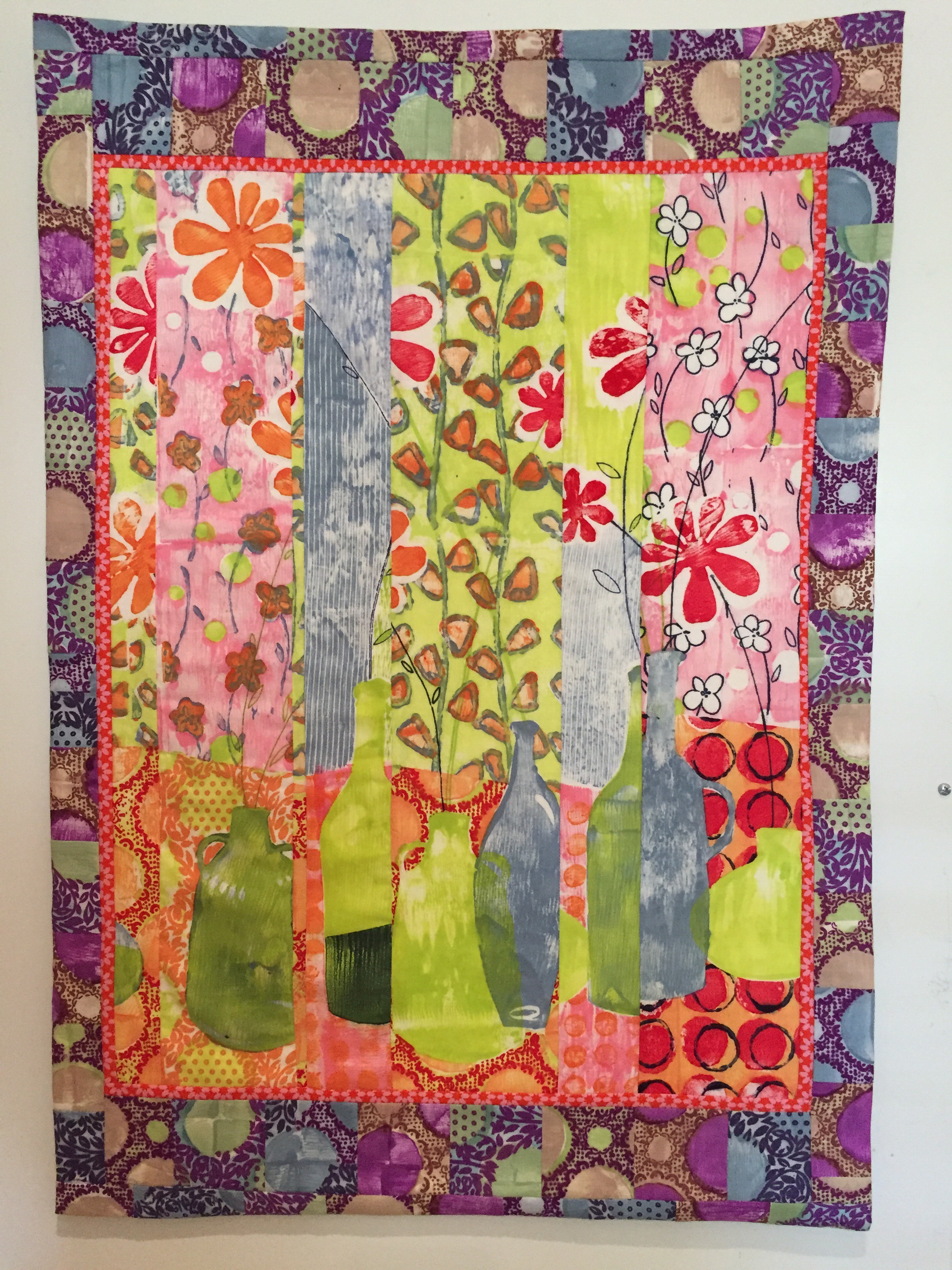My first class is called, Monoprint, Resist and Stamp: A Vibrant Still Life. This class is based on my Live your Brightest Life contribution to Yvonne Porcella’s tribute of the same name. While this may look complex, the class will break down the steps necessary to build and layer similar imagery while utilizing mono-printing, freezer paper resist and stamping methods together with Procion MX dyes.