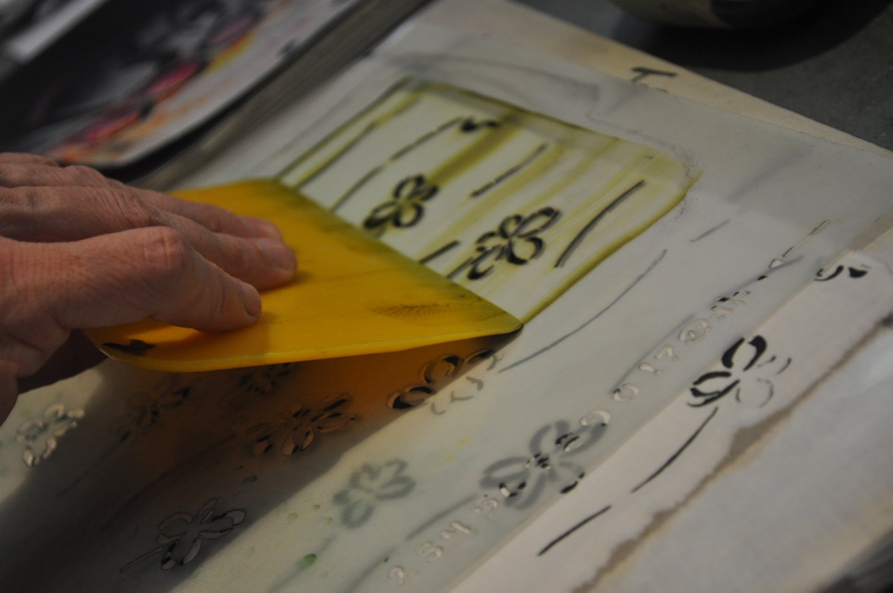 I have found my StencilGirl stencils very easy to print when using a simple hand squeegee. I like to squeegee through stencils utilizing a padded work surface (page 76, Playful Fabric Printing). A hand towel will work just as well as our tested, June Tailor boards. But please check out that section of the book too. We have some neat hacks and upgrades to the board that will enable you to print in repeat using Thermofax screens too! But, hey, back to the stencils!