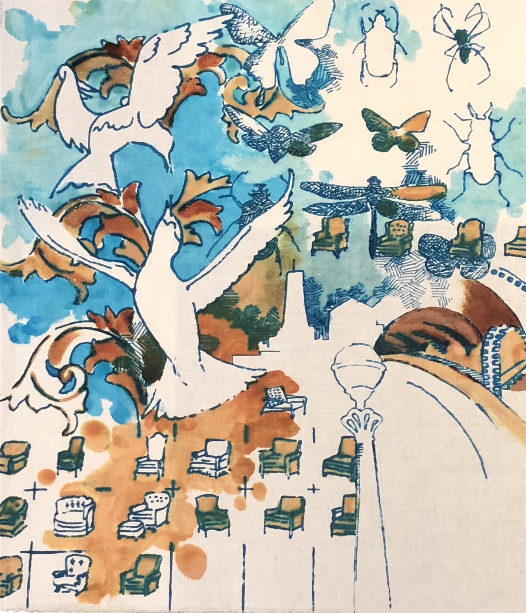 This piece combines Common Tern, which uses the east coast of the United States as nesting ground, with drawings of chairs from Upholstery Yardage Sheets. This is a visual pun that describes me, an armchair birder! Then I added a drawing of a New York City skyline and the City Hall Subway station. Living in the city, I sometimes forget that Common Terns are living near and around me, as this is a city surrounded by water, marshes and beaches!