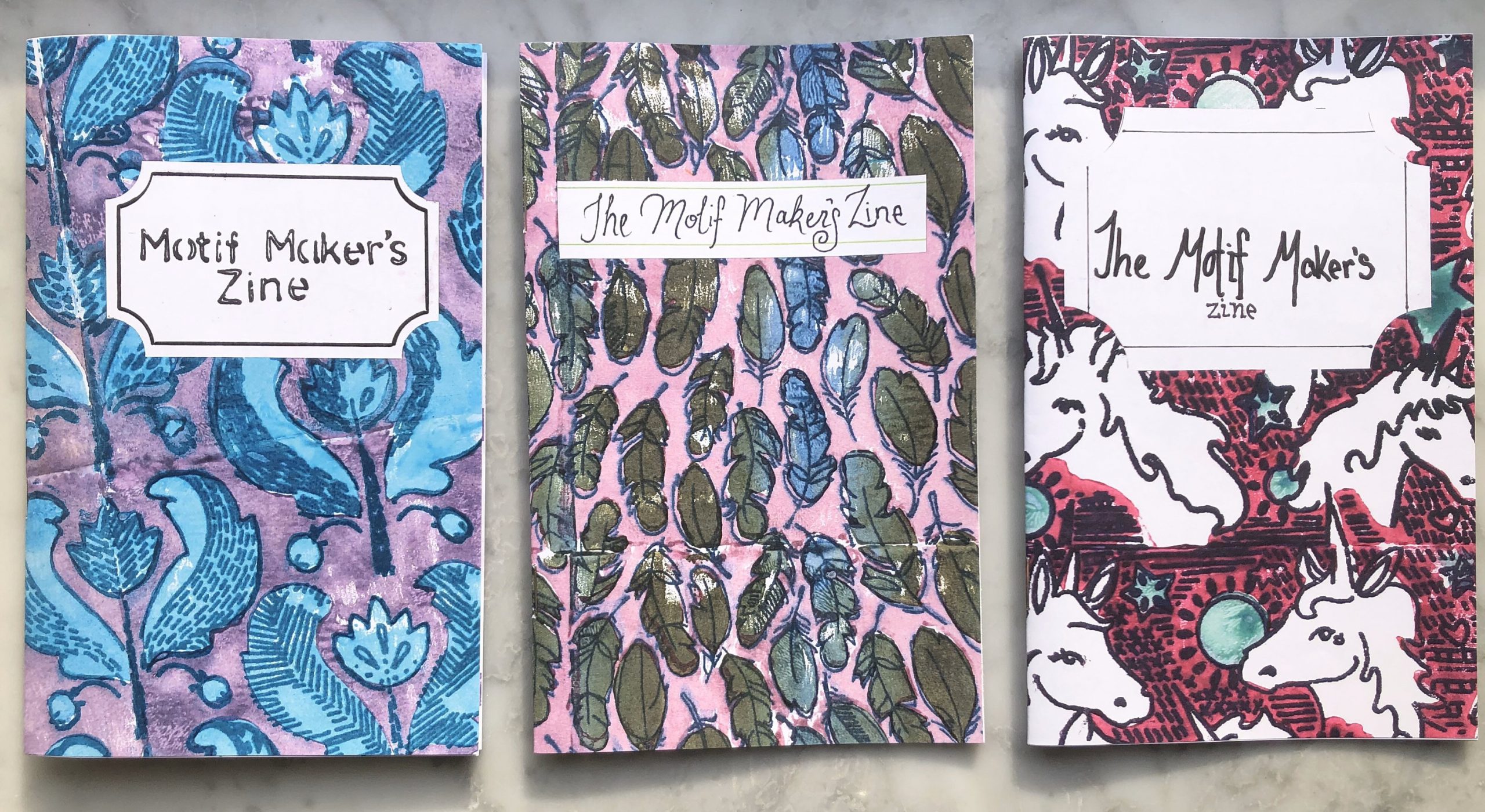 The Motif Maker’s Zine has three volumes so far. The first volume showcases how to make a motif, while working in various media and a change of scale. Volume 2 discusses making motifs that interact and play well with one another (unicorns, feathers, pinking sheers-oh my!). Volume 3 discusses how pattern and texture can interact with motif to elevate and enrich your design. Each of the Zines references pages from my book, Playful Fabric Printing, drawing upon and expanding the knowledge found there, while helping you build and use motifs of your own creation.