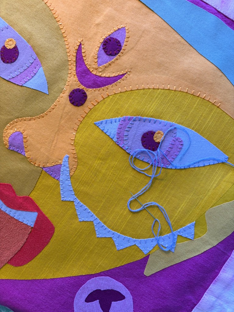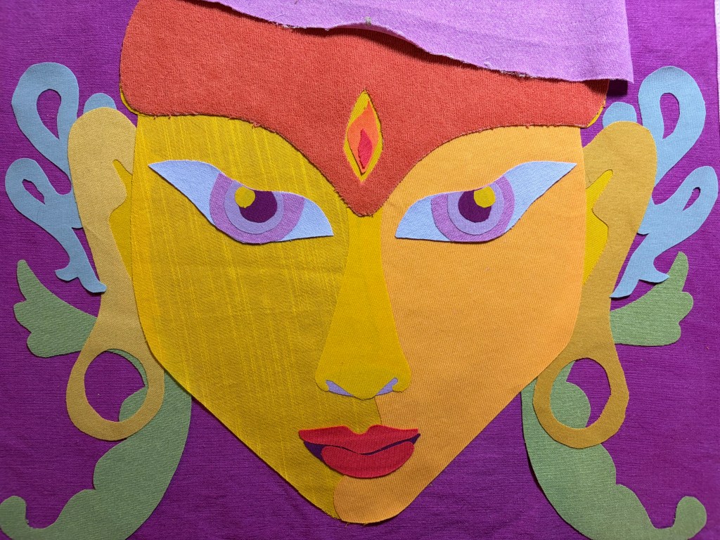 I call upon the strength and dignity provided by the Goddesses, Kali and Tara. I honor them and choose to depict them while conjuring their best qualities as ones I want to experience in this world, one stitch at a time. I feel blessed to have been given these fabrics and to explore the power in female deity.