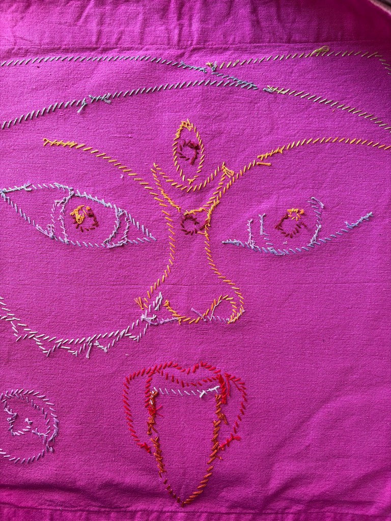 Recently, I was given a stash of upcycle ready fabrics, cleanly cut sleeves in cotton plaid, cotton and rayon t-shirt materials, chunky sweater materials too. Among this varied and color saturated pile, were two fuchsia, cotton canvas, hemmed squares. Each was a slightly different finished measurement than the other. As I walked through this persons home, I lit upon three similarly hemmed, coaster size pieces, each with hand embroidered faces, which I have learned were from Guadalajara. The stitches used were crude and long, but so very effective at depicting out stretched tongues and large expressive eyes. I was enamored.