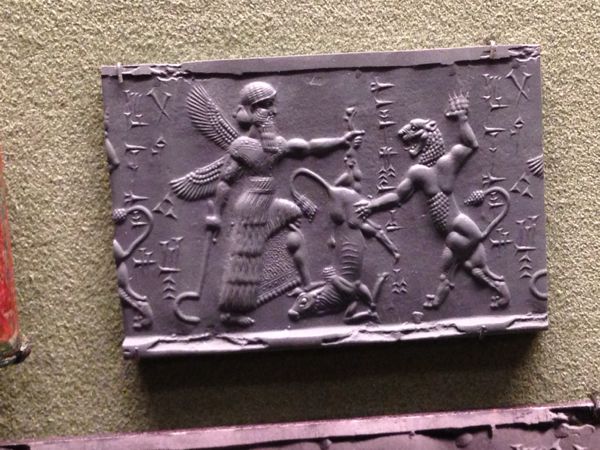 What you see here is the imprint of an ancient seal. Seeing the minute detail in these seals and knowing a human, at one time, held, carved and used these little pieces of magic is amazing. What you see here is the seal itself, not the carved cylinder that creates the impression (that can been seen as a tiny bit of red at far left, but I did not capture it in photograph).