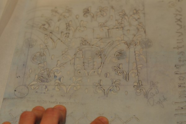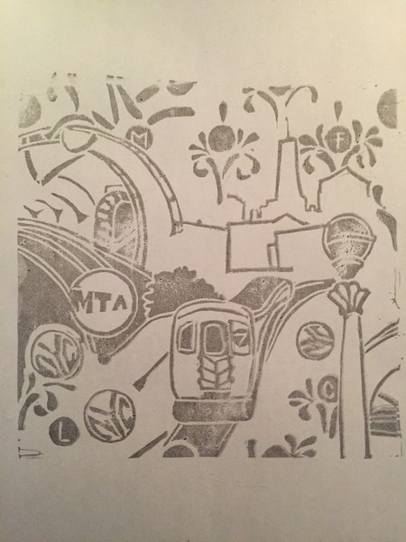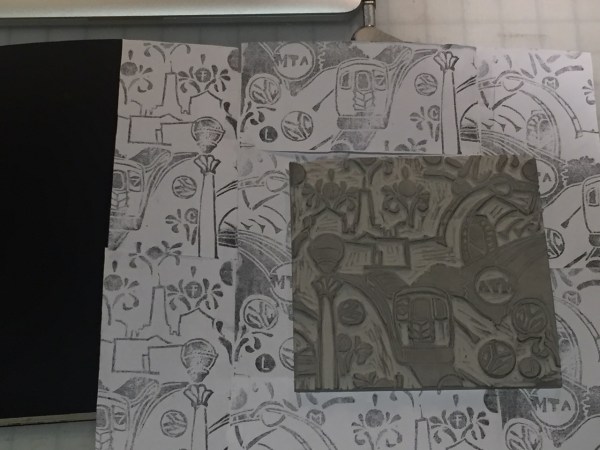 The graffiti element I spoke about in my last post? I decided to use the StencilGirl Scroll Y100rev as a graffiti like element in my NYC MTA Subway carved rubber layer. You see above, I traced out a few of the scrolls from the stencil to fill the ‘negative space’ with a graffiti like spray of scrolls. At least this is my hope.