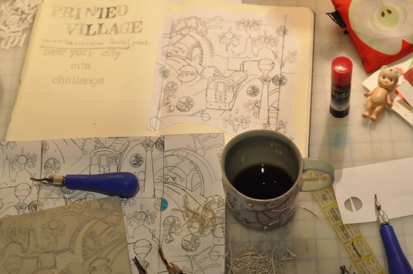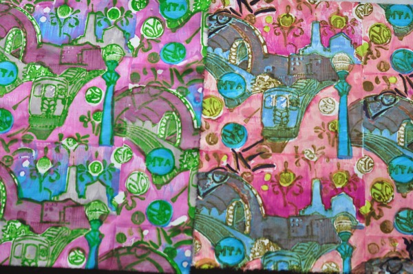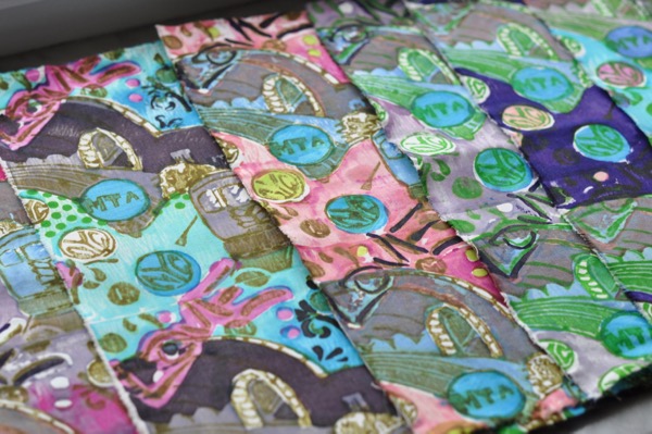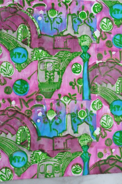 I recently came across Printed Village, (did you know about it? And if so, why have you been holding back on me?) And? Of course, I have decided to partipate in one of their challenges. This site offers ‘story boards’ and deadlines for a surface design artists to create work on a theme, with prizes. Reread that last sentence. What more could a girl ask for? I have been wanting to design around the theme of NYC since I began Free Range Textile Printing, last summer. The theme of this challenge is specifically asking for artwork on the theme of the New York City Subway.