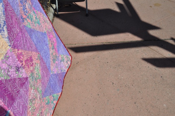 My love of the Half Square Triangles will not abate! The initial cut size is such that quilt tops quickly emerge, which is especially to my liking. I like making quilts, quick and easy. Large blocks help me do that. I really appreciate the back side of handprints too. The above print (the red) must have been a really juicy print to smoosh through the cotton print cloth like that! And it is so pretty to see how the printed layers of color interact with each other.