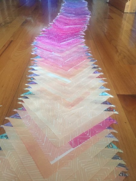 Since taking this Free Range Textile Printers show on the road, I have printed about 80 Lace Swirl and Herring Bone fat sixteenths in total. In keeping with a recent love affair with Half Square Triangles, I went to work trimming them all to 8.25″, I like to cut them one at a time to maximize them as much as possible. After which, I paired them, right sides together, in groups of two, with an eye toward a light/dark pairing. I then marked them with pencil before piecing, cutting and ironing. This quilt has me thinking about the use of starch when ironing, so I went to Facebook to ask others for their experience. This interesting thread emerged. Check it out!