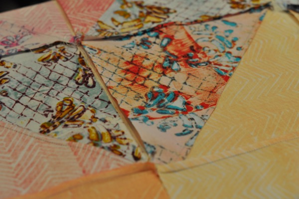 One thing that I have totally fallen in love with because of this quilt is printing on Cotton Sateen. The peach pink at left is an example of this, though it is quite difficult to photograph the subtle visual difference and in blog post, it is impossible to illustrate how soft this fabric is. I printed just a few pieces of the cotton sateen, I don’t have much on hand, but wanted to use it anyway and think it a success. Having even a few pieces of this cloth in the mix livens up the top tremendously, lending a subtle sheen and a soft touch.