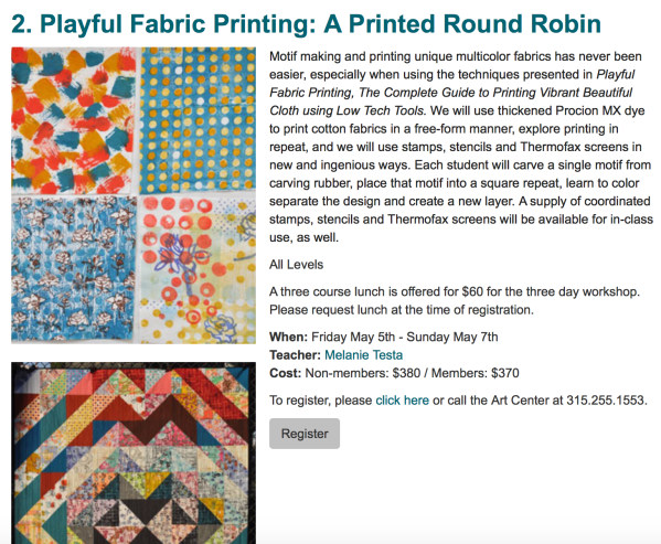 I hope to teach at Schweinfurth Art Center in May, please join me. This class will expand upon the principle presented in Playful Fabric Printing.