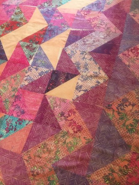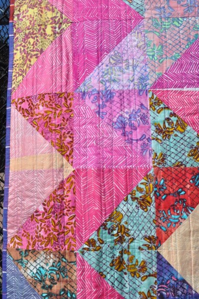 I tried to stay within an analogous area of the color triangle, from purple, reds and yellows. I printed a total of 34 Lace Swirl Prints and 54 Chevrons. This means I printed about 5 yards of cloth! From start to finish, this quilt was printed, steamed, washed, cut, pieced, basted, machine quilted and bound in one months time! Wow. Pretty snazzy.