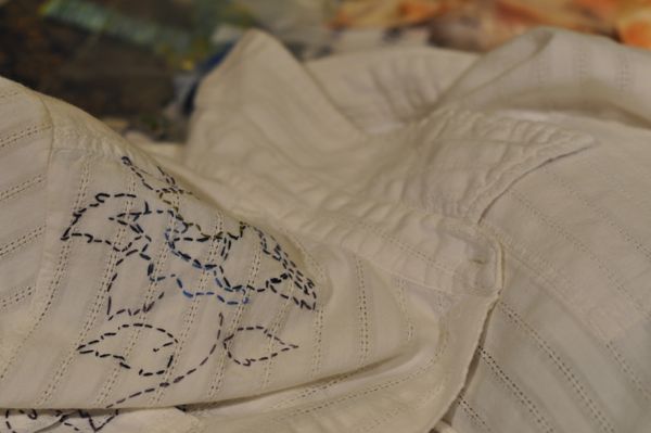 And I am using a multicolor stencil to embroider a rose design up over the right breast pockets, around the back yoke, and perhaps a few sprigs draping down the left shoulder seam, I don’t know yet.