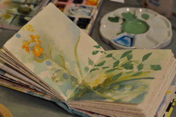 I have given these palettes to friends as a fun gift and one friend said she has a hard time using this palette because it is so small. She likes to mix a fair amount of paint and do washes, so this palette is not suited to that type of work. Assess how you think you would use paints while working on the go. Wrap the palette in saran wrap for an easy ‘mixing tray’, nab a paper coffee cup as a rinsing cup after breakfast in the morning, tuck a small paper towel into the lid of the travel palette to help dry it out when you are ready to pack up your supplies and dump them into you back pack.