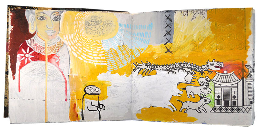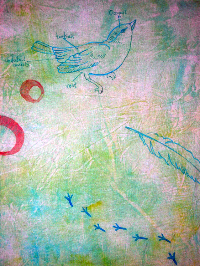 Gouache, Watercolor Paint, Uniball Signo Metallic Pen, Tracing Paper, Hand Carved Stamps -