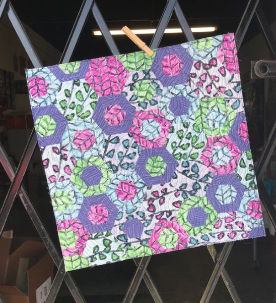 For the Florabunda! Blog Hop Celebration, Jamie contributed this 18×18″ square wall art piece, called Hexi Spring. Knowing Jamie as I do, this a raw edge appliqué using Mistyfuse, our preferred fusible.