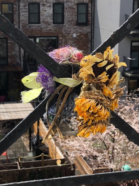 The image above shows that I have combined some sunflowers (the birds devoured the dried seeds within -Thanks Mom!) with threads for their nests. It seems like a win-win for our feathered friends! Food and nesting material, all on one NYC fire escape! What a great way to use up thread scraps!