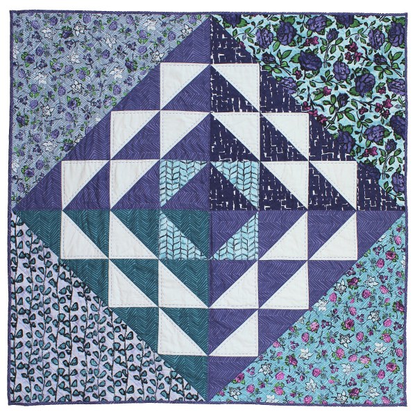 In this baby quilt, Kathy used the blue range of fabrics in Florabunda! As we quilters do, she added some white, which allows visual relief as well as pop and sparkle. This pleasing baby quilt was hand quilted too.