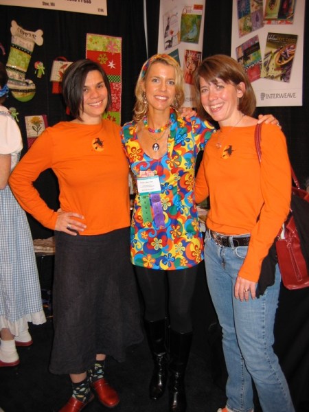 In the photograph below, I had just published Inspired to Quilt, which you can see on a banner-ad above Pokey and Deborah’s heads. That was more than 10 years ago! Such good times! [I have since published two more books, Dreaming from the Journal Page and Playful Fabric Printing] Deborah has published her own book too, Art Quilt Collage which covers many of the techniques she used in making the above wall art series. I highly recommend it.