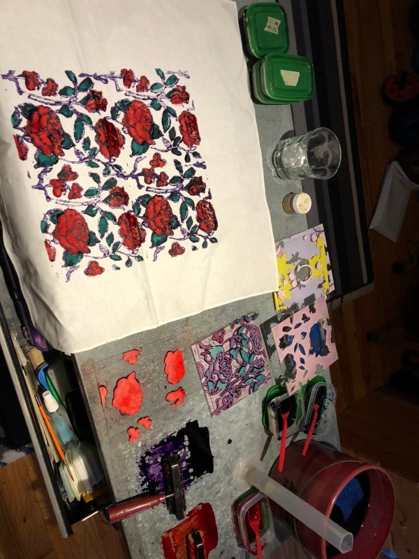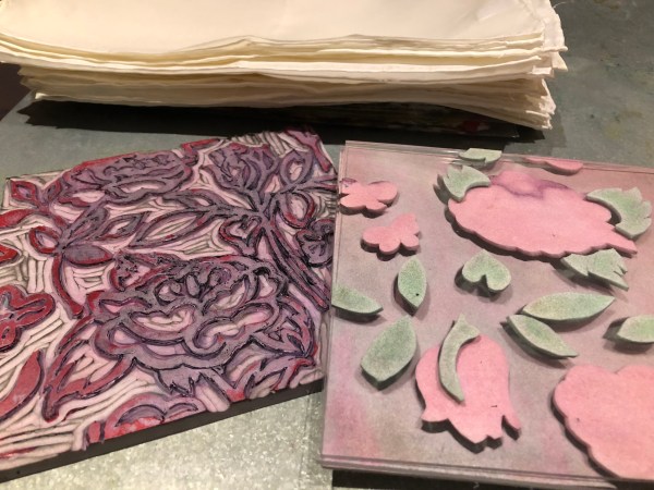 The above image shows the carving at the half-way point. The background needs to be removed. I always stop at just the point, make a strike off and print a few on cloth, before proceeding to the finish mark. This has been so much fun to carve. I look forward to completing this!