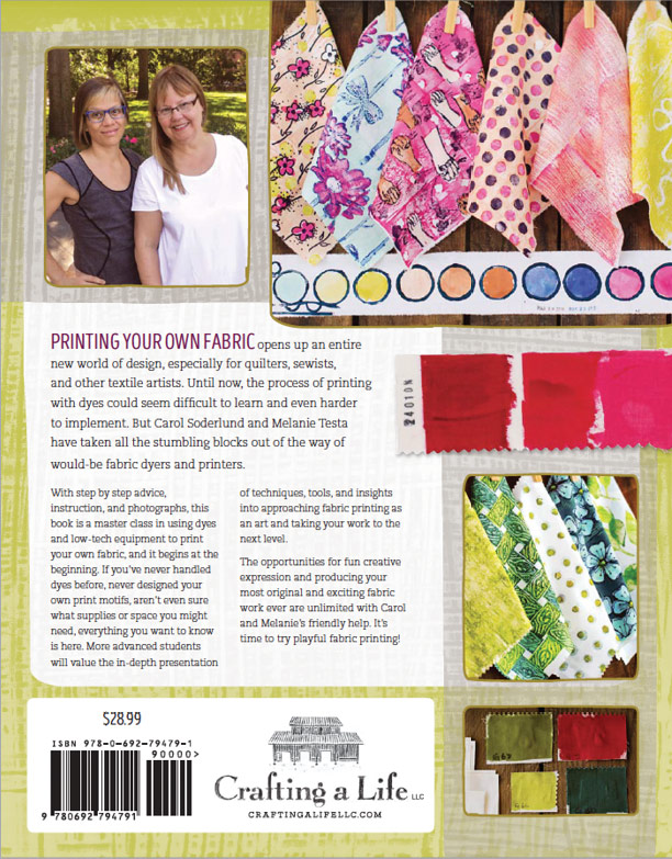 Printing your own fabric opens up an entire new world of design, especially for quilters, sewists, and other textile artists. Until now, the process of printing with dyes could seem difficult to learn and even harder to implement. But Carol Soderlund and Melanie Testa have taken all the stumbling blocks out of the way of would-be fabric dyers and printers.